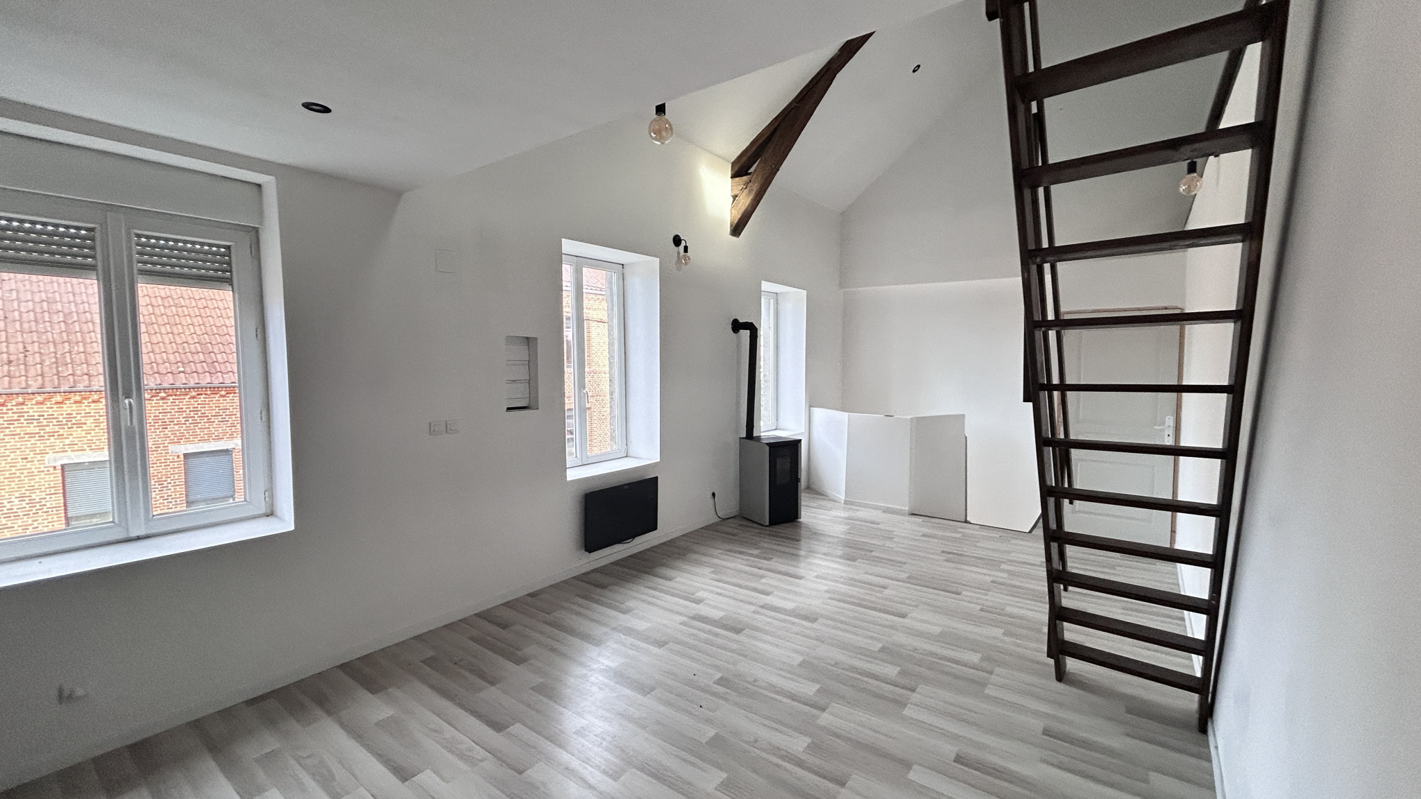 Très bel appartement individuel en dupleix entièrement rénové, offrant 1 entrée avec dégagement, 1er étage : beau séjour ouvert sur cuisine meubllée et équipée avec feu à pellets, 1 wc, à l'étage : 1 garnde chambre de 35 M2 en mezzanine, 1 salle de douche.